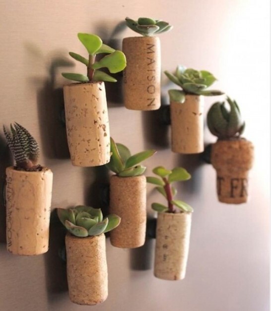 Rolhas de garrafas de vinho e champagne podem ser reutilizadas para montar um minijardim e decorar ambientes da casa e do trabalho. Ele ocupa pouco espaço e é simples de fazer. Com o ímã na lateral do vaso você pode colocá-lo num painel de metal ou até mesmo na geladeira.